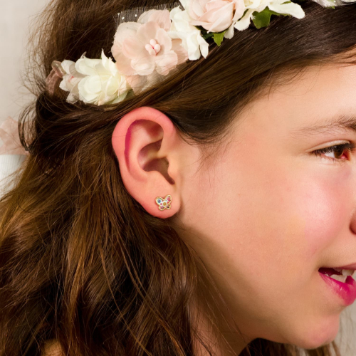 18K PENDIENTES ORO AMARILLO MARIPOSAS NACAR COLORES. 9X7 MM CIERRE PRESION 0