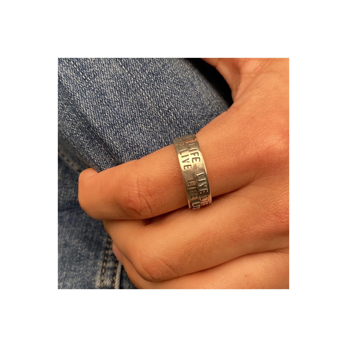 Anillo de Plata 925 con la inscripción 'Live Life' en la parte exterior y la inscripción 'PLATADEPALO' en su interior.